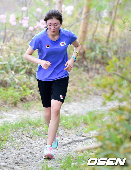 쇼트트랙 심석희가 크로스컨트리장 산악 코스에서 체력 훈련을 하고 있다.
