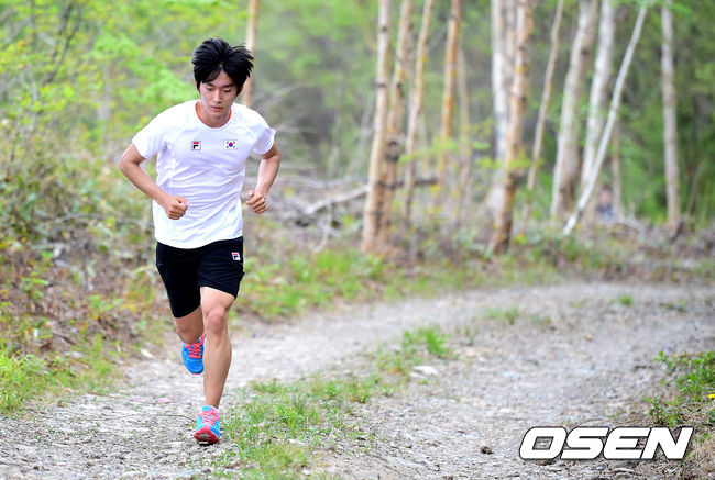 스피드 주형준이 크로스컨트리장 산악 코스에서 체력 훈련을 하고 있다.