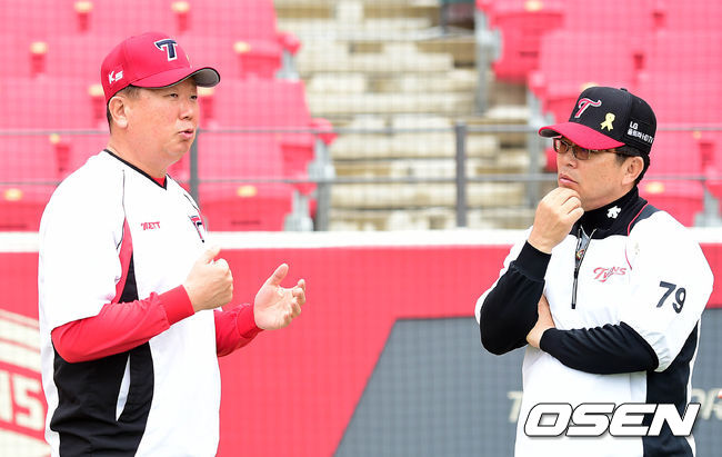 경기에 앞서 KIA 선동렬 감독과 LG 양상문 감독이 이야기를 나누고 있다.
