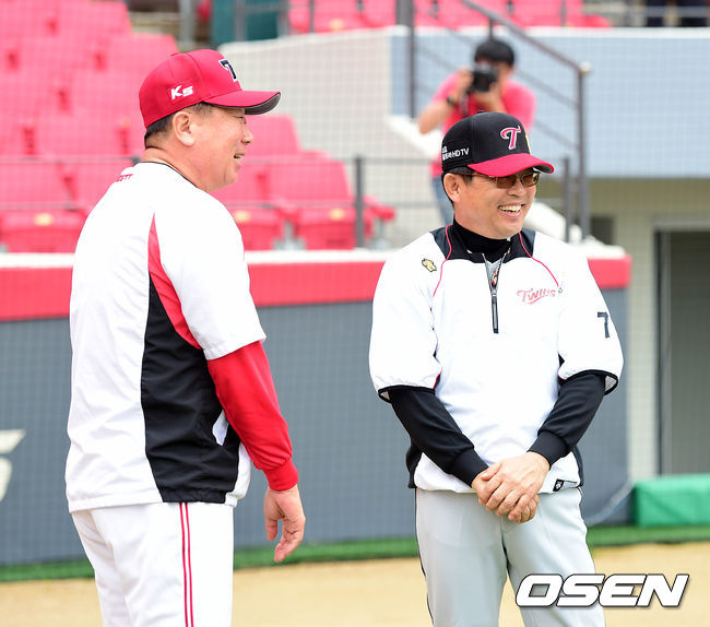 경기에 앞서 KIA 선동렬 감독과 LG 양상문 감독이 이야기를 나누고 있다.