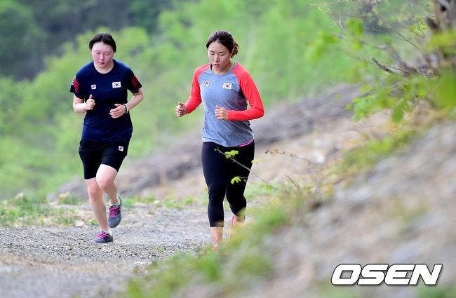 스피드 노선영, 이상화가 크로스컨트리장 산악 코스에서 체력 훈련을 하고 있다.