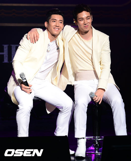 20일 오후 서울 방이동 올림픽공원 K-아트홀에서 진행된 플라이투더스카이 9집 '컨디뉴엄' 컴백 쇼케이스에서 브라이언과 환희가 미소짓고 있다.