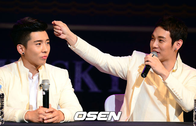 20일 오후 서울 방이동 올림픽공원 K-아트홀에서 진행된 플라이투더스카이 9집 '컨디뉴엄' 컴백 쇼케이스에서 브라이언과 환희가 1위 공약에 대한 질문에 답을 하고 있다.