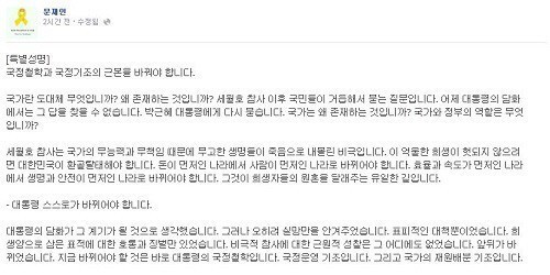 또 특별 성명에서 해경을 해체하겠다는 박 대통령 발언에 대해서는 “해경 해체, 해수부 축소는 포퓰리즘(대중영합주의) 처방이라는 비판을 받아야 한다”며 “해경과 해수부에 필요한 것은 사안에 따른 엄중문책 이후 전문역량 강화와 조직 혁신이지 해체와 권한 약화가 아니다”라고 말했다.