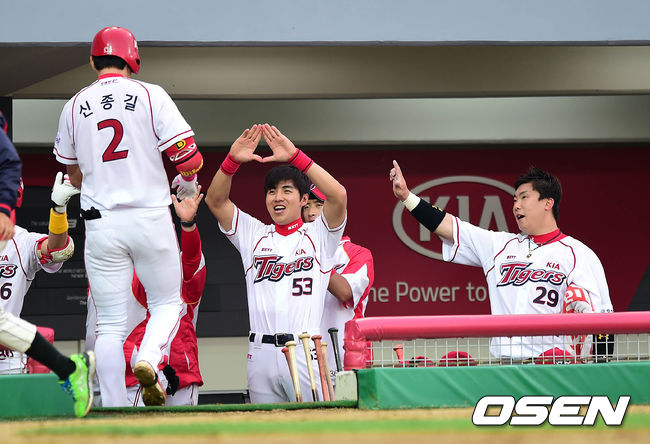 2회말 무사에서 KIA 신종길이 좌중월 솔로 홈런을 치고 더그아웃에서 동료들과 하이파이브를 하고 있다.