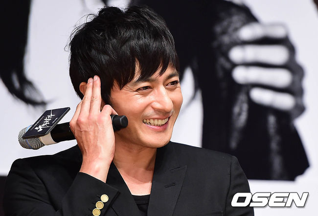 배우 장동건이 쇼케이스에 참석해 사회자의 질문에 답하며 미소짓고 있다.