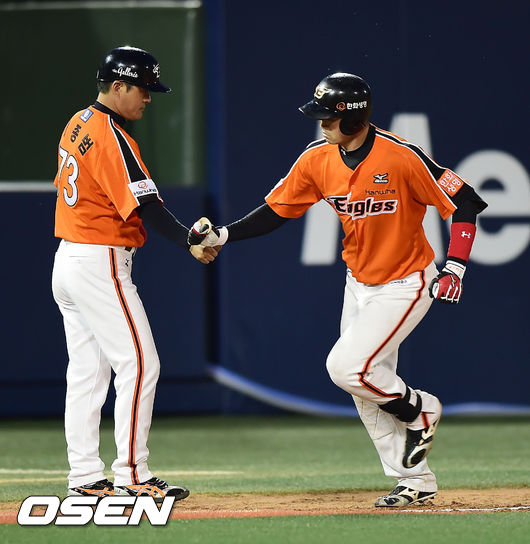 20일 오후 서울 목동구장에서 열린 ‘2014 한국야쿠르트 세븐 프로야구’ 넥센 히어로즈와 한화 이글스의 경기, 5회초 1사 한화 송광민이 좌월 솔로 홈런을 날린 후 3루에서 이종범 코치와 하이파이브를 하고 있다.
