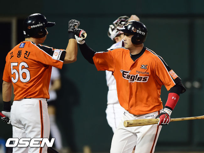 20일 오후 서울 목동구장에서 열린 ‘2014 한국야쿠르트 세븐 프로야구’ 넥센 히어로즈와 한화 이글스의 경기, 5회초 1사 한화 송광민이 좌월 솔로 홈런을 날린 후 홈에서 고동진과 하이파이브를 하고 있다.