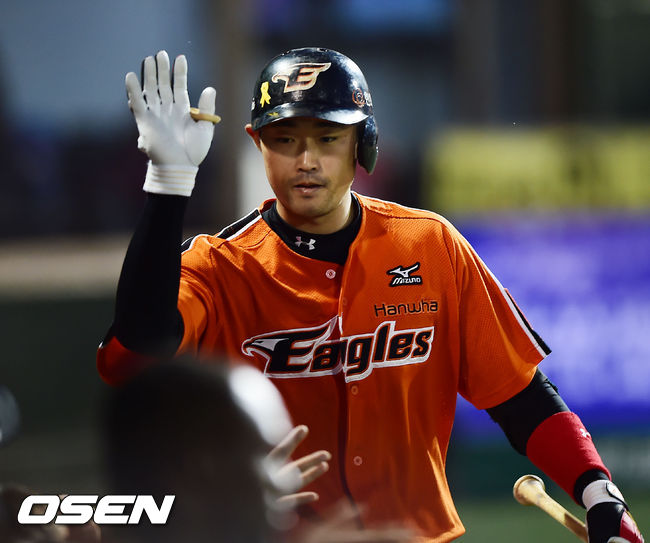 20일 오후 서울 목동구장에서 열린 ‘2014 한국야쿠르트 세븐 프로야구’ 넥센 히어로즈와 한화 이글스의 경기, 5회초 1사 한화 송광민이 좌월 솔로 홈런을 날린 후 덕아웃에서 동료들과 하이파이브를 하고 있다.
