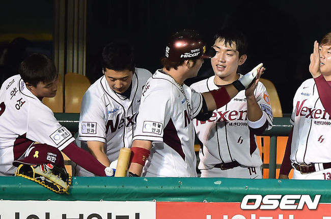 20일 오후 서울 목동구장에서 열린 ‘2014 한국야쿠르트 세븐 프로야구’ 넥센 히어로즈와 한화 이글스의 경기, 5회말 넥센 선두타자 박병호가 중월 솔로 홈런을 날린 후 덕아웃에서 동료들과 하이파이브를 하고 있다.