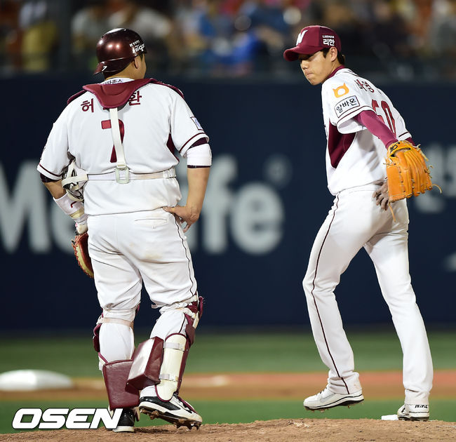 20일 오후 서울 목동구장에서 열린 ‘2014 한국야쿠르트 세븐 프로야구’ 넥센 히어로즈와 한화 이글스의 경기, 6회초 1사 주자 1,3루 한화 정근우 타석에서 넥센 선발 하영민이 교체되고 있다.