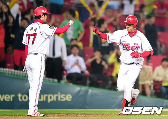 5회말 1사 만루에서 KIA 이범호가 만루 홈런을 치고 김종국 코치와 하이파이브를 하고 있다.
