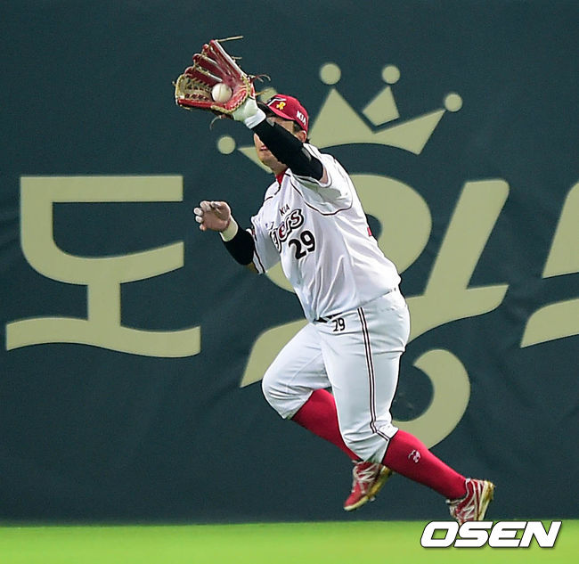 6회초 1사 만루에서 KIA 나지완이 LG 이병규의 타구를 잡고 있다.