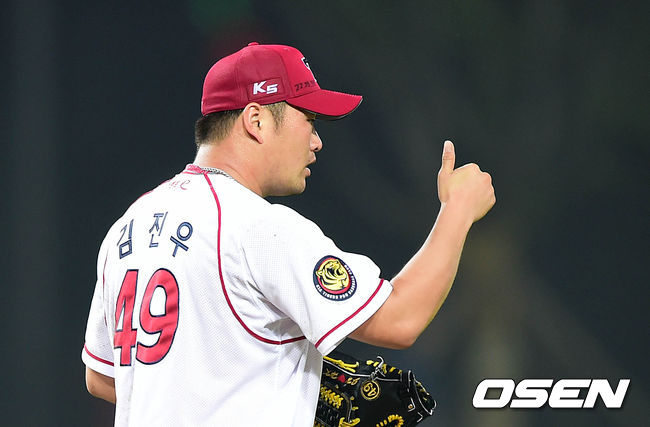 6회초 KIA 김진우가 야수들을 향해 엄지를 들어올리고 있다.