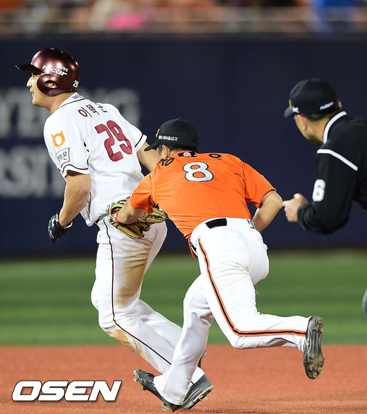 20일 오후 서울 목동구장에서 열린 ‘2014 한국야쿠르트 세븐 프로야구’ 넥센 히어로즈와 한화 이글스의 경기, 7회말 1사 주자 2루 넥센 강정호의 3루수 앞 땅볼때 2루 주자 이택근이 런다운에 걸리며 한화 2루수 정근우에게 태그아웃 당하고 있다.