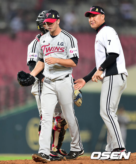 5회말 1사 만루에서 LG 티포드가 마운드를 내려가고 있다.