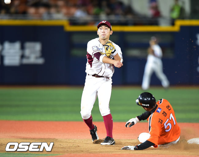 20일 오후 서울 목동구장에서 열린 ‘2014 한국야쿠르트 세븐 프로야구’ 넥센 히어로즈와 한화 이글스의 경기, 8회초 무사 주자 1루 한화 정범모의 3루수 병살타때 넥센 2루수 서건창이 2루에서 김경언을 포스아웃시킨 후 1루로 송구하고 있다.