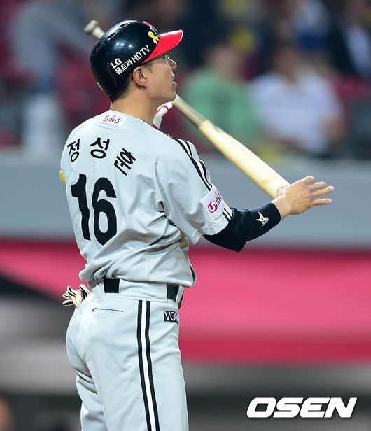 7회초 2사 1루에서 LG 정성훈이 역전 투런 홈런을 치고 타구를 바라보고 있다.