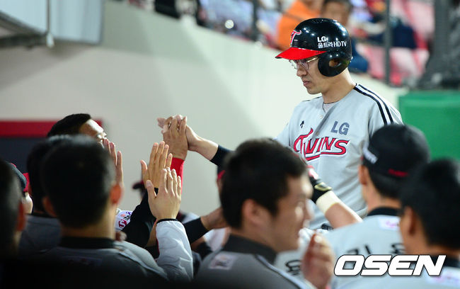 7회초 2사 1루에서 LG 정성훈이 역전 투런 홈런을 치고 더그아웃에서 동료들과 하이파이브를 하고 있다.