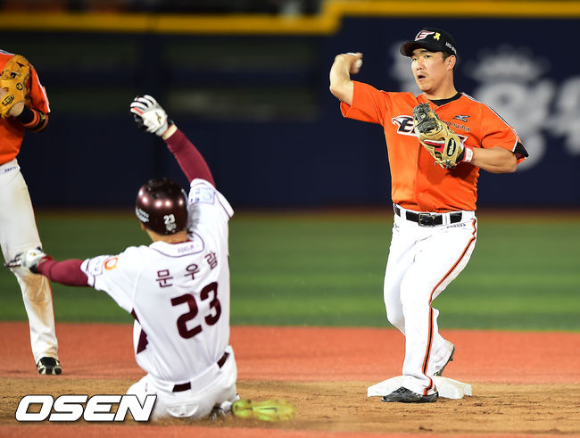 20일 오후 서울 목동구장에서 열린 ‘2014 한국야쿠르트 세븐 프로야구’ 넥센 히어로즈와 한화 이글스의 경기, 8회말 1사 주자 1루 넥센 허도완의 유격수 앞 병살타때 한화 2루수 정근우가 2루에서 문우람을 포스아웃 시킨 후 1루로 송구하고 있다.
