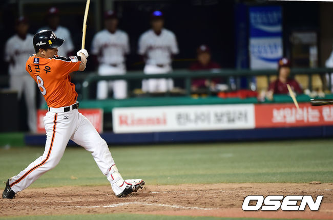 20일 오후 서울 목동구장에서 열린 ‘2014 한국야쿠르트 세븐 프로야구’ 넥센 히어로즈와 한화 이글스의 경기, 9회초 한화 선두타자 정근우가 투수 앞 땅볼 타구를 날릴때 배트가 깨지며 파편들이 넥센 마무리 손승락에게 향하고 있다.