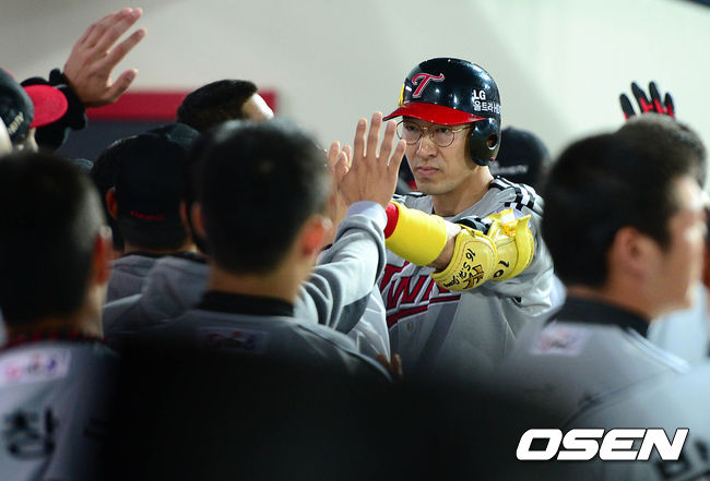 7회초 2사 1루에서 LG 정성훈이 역전 투런 홈런을 치고 더그아웃에서 동료들과 하이파이브를 하고 있다.