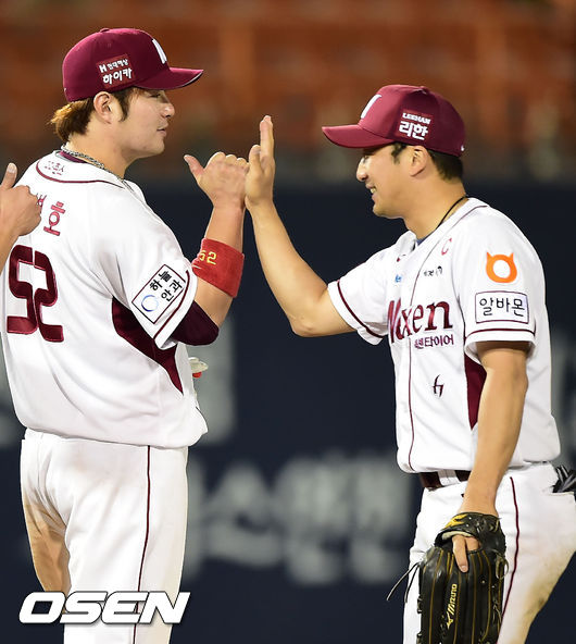 경기를 마치고 박병호가 이택근과 하이파이브를 하고 있다. / rumi@osen.co.kr