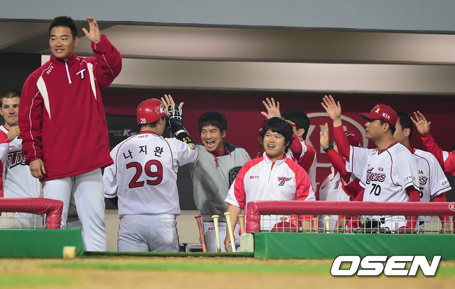 7회말 2사 만루에서 KIA 이종환의 우중간을 가르는 2타점 적시타때 홈을 밟은 3루주자 나지완이 더그아웃에서 동료들과 하이파이브를 하고 있다.