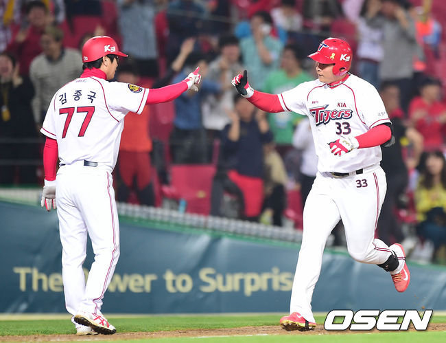 8회말 1사에서 KIA 김주형이 좌월 솔로 홈런을 날리고 김종국 코치와 하이파이브를 하고 있다.