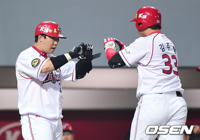 8회말 1사에서 KIA 김주형이 좌월 솔로 홈런을 날리고 홈에서 나지완과 하이파이브를 하고 있다.