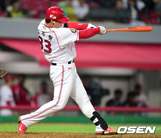 8회말 1사에서 KIA 김주형이 좌월 솔로 홈런을 날리고 있다.
