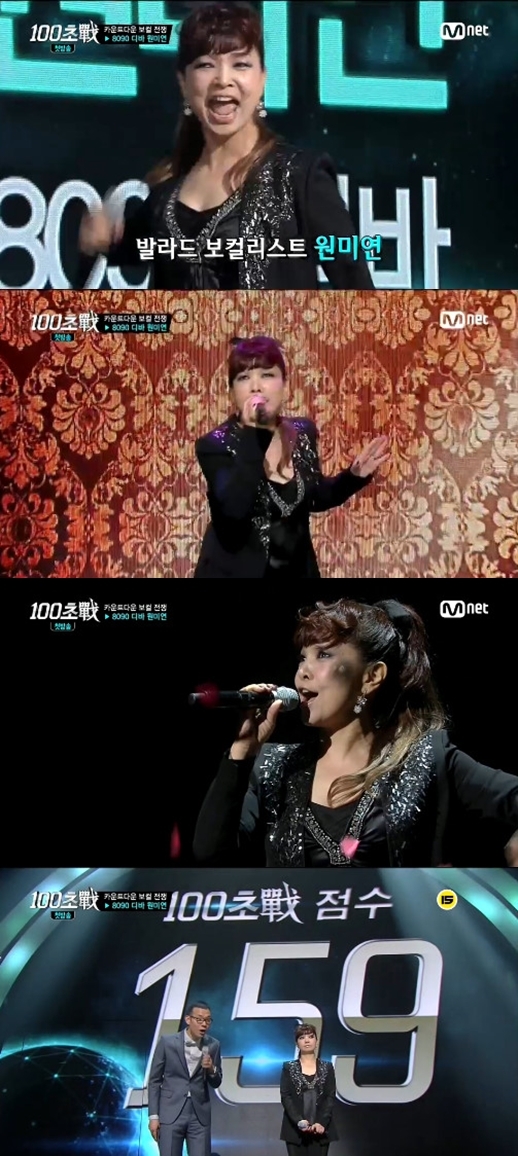 원미연은 20일 오후 방송된 mnet ‘100초전’에 마지막 가수로 등장, 김건모의 ‘사랑이 떠나가네’를 열창했다.