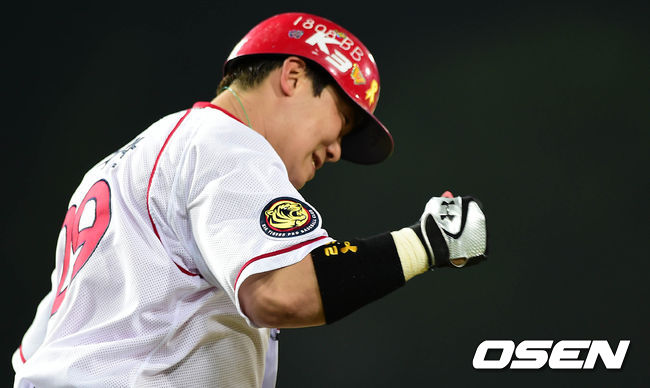 8회말 2사에서 KIA 나지완이 좌월 솔로 홈런을 치고 환호하고 있다.