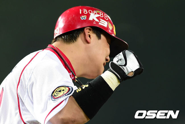 8회말 2사에서 KIA 나지완이 좌월 솔로 홈런을 치고 환호하고 있다.
