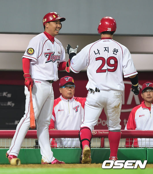 8회말 2사에서 KIA 나지완이 좌월 솔로 홈런을 치고 더그아웃에서 이범호의 축하를 받고 있다.