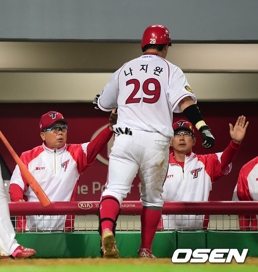 8회말 2사에서 KIA 나지완이 좌월 솔로 홈런을 치고 더그아웃에서 선동렬 감독과 하이파이브를 하고 있다.