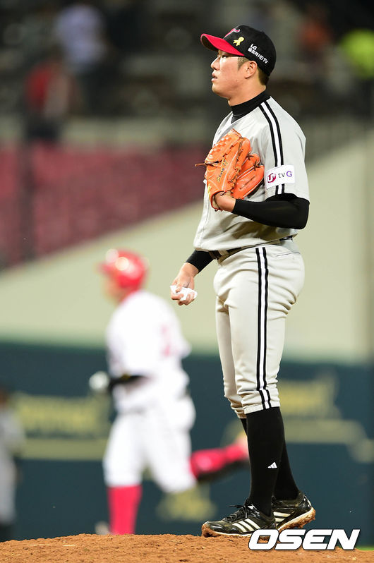 8회말 2사에서 KIA 나지완에게 좌월 솔로 홈런을 허용한 LG 유원상이 아쉬운 표정을 짓고 있다./sunday@osen.co.kr