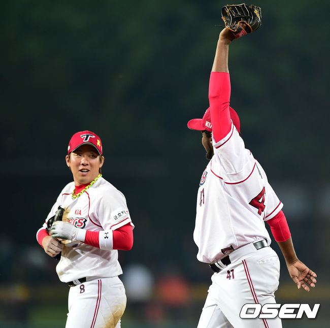 경기 종료 후 KIA 어센시오와 안치홍이 이야기를 나누며 그라운드를 나가고 있다./sunday@osen.co.kr