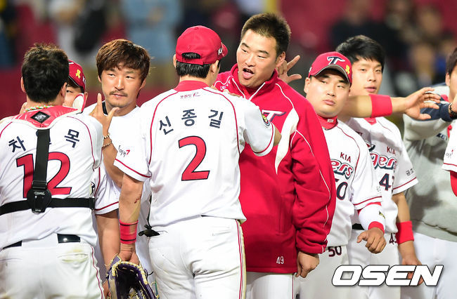 경기 종료 후 KIA 김진우가 동료들과 승리의 기쁨을 나누고 있다./sunday@osen.co.kr