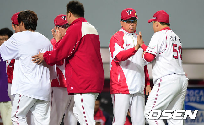 경기 종료 후 KIA 선동렬 감독이 선수들과 승리의 기쁨을 나누고 있다./sunday@osen.co.kr