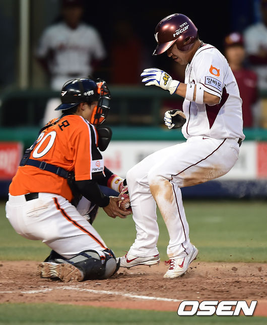 송광민의 송구가 군더더기 없이 포수 정범모에게 향했고, 홈으로 들어오는 김민성보다 더 빨랐다. 정범모가 공을 먼저 잡고 기다린 상황으로 그의 미트가 김민성의 오른 정강이에 먼저 닿았다. 타이밍상으로도 완벽한 아웃. 이 과정에서 김민성은 정범모와 충돌을 피하기 위해 두 발이 홈플레이트를 건너뛰었다.