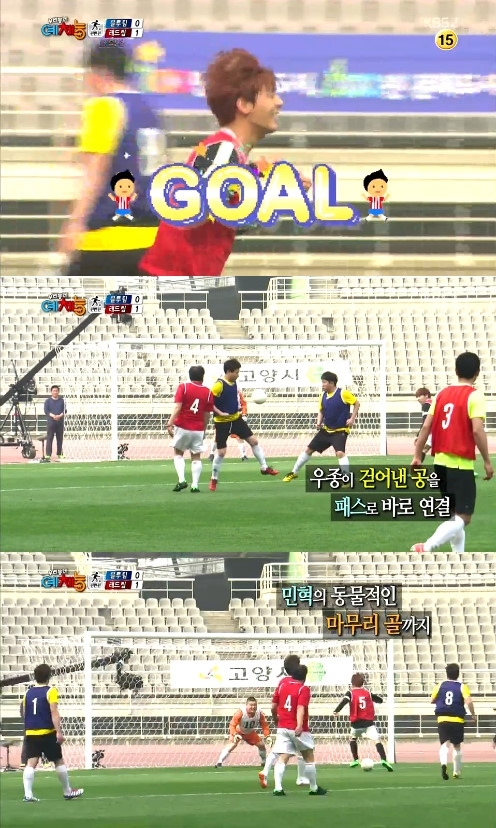 이날 민혁은 활약과 함께 경기 초반 레드팀에게 첫 골을 선사했다. 그는 조우종 아나운서가 걷어 낸 공을 패스로 이어 받아 동물적인 감각으로 골문을 두드렸다. 이날 경기의 첫 골의 영광을 안은 민혁은 환한 미소를 감추지 못했다.
