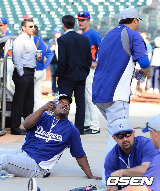 21일(이하 한국시간) 미국 뉴욕주 뉴욕 퀸스 씨티 필드에서 열리는 '2014 메이저리그' 뉴욕 메츠와 LA 다저스의 경기 시작전 류현진이 유리베와 장난을 치고 있다.