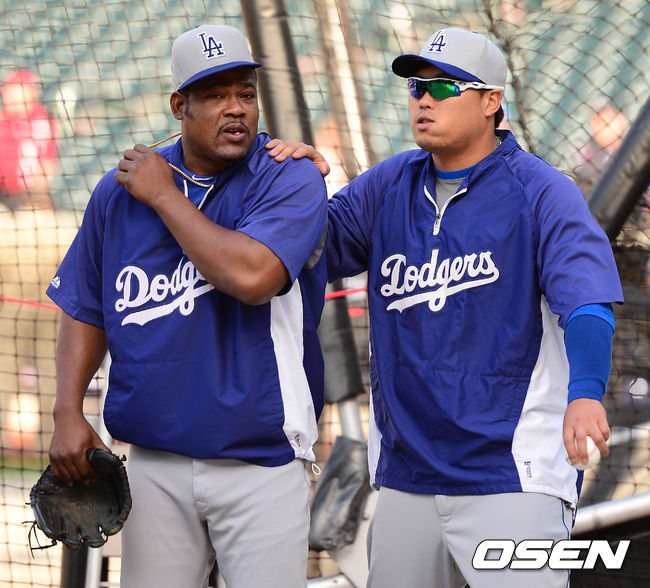 21일(이하 한국시간) 미국 뉴욕주 뉴욕 퀸스 씨티 필드에서 열리는 '2014 메이저리그' 뉴욕 메츠와 LA 다저스의 경기 시작전 류현진이 유리베와 장난을 치고 있다.