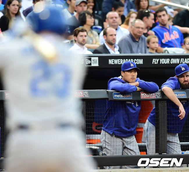 21일(이하 한국시간) 미국 뉴욕주 뉴욕 퀸스 씨티 필드에서 열린 '2014 메이저리그' 뉴욕 메츠와 LA 다저스의 경기 1회초 류현진이 덕아웃에서 경기를 지켜보고 있다.