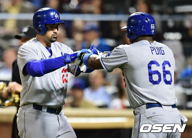21일(이하 한국시간) 미국 뉴욕주 뉴욕 퀸스 시티 필드에서 열린 '2014 메이저리그' 뉴욕 메츠와 LA 다저스의 경기 5회초 1사 1루 곤살레스가 투런포를 치고 홈에서 푸이그와 하이파이브를 하고 있다.