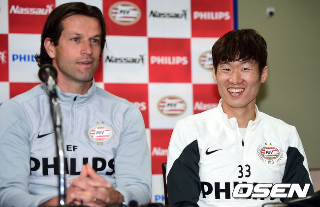박지성이 에르네스트 파베르 PSV 수석코치와 기자회견을 갖고 있다.