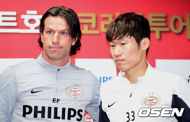 박지성과 에르네스트 파베르 PSV 수석코치가 포토타임을 갖고 있다.