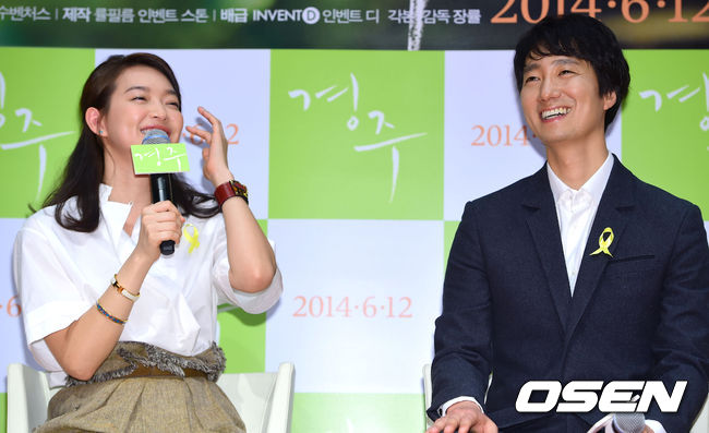 21일 오전 서울 건대입구 롯데시네마에서 진행된 영화 '경주'(장률 감독) 제작보고회에서 배우 신민아와 박해일이 미소 짓고 있다.
