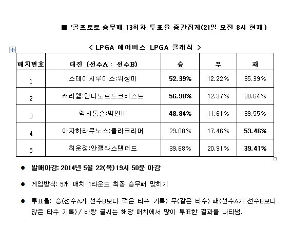 LPGA 에어버스 LPGA 클래식 1라운드 대상 승무패13회차 중간집계 결과
